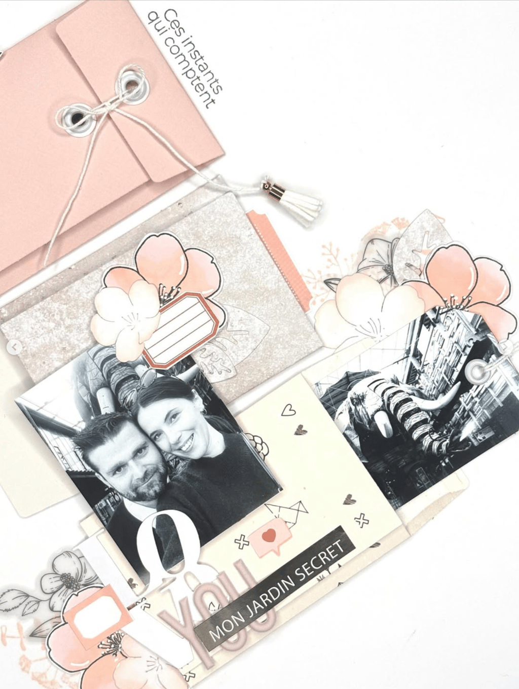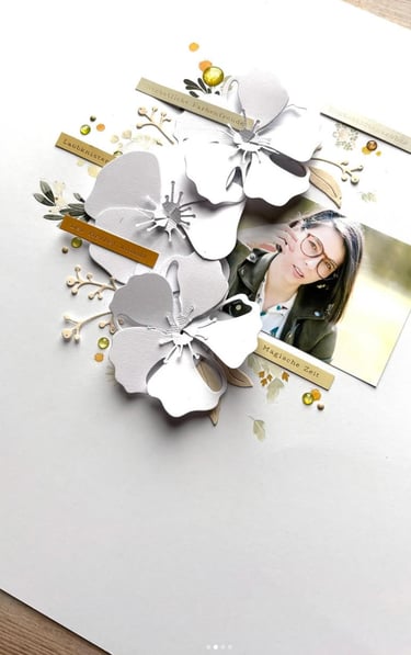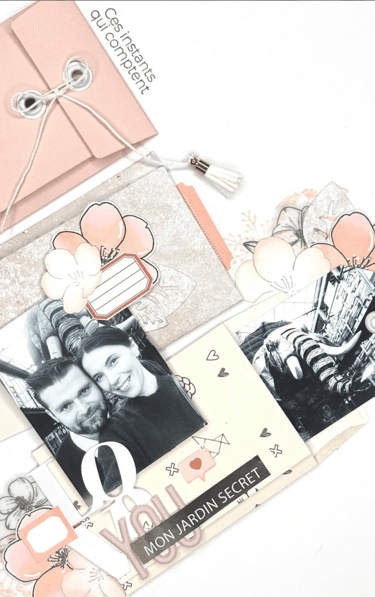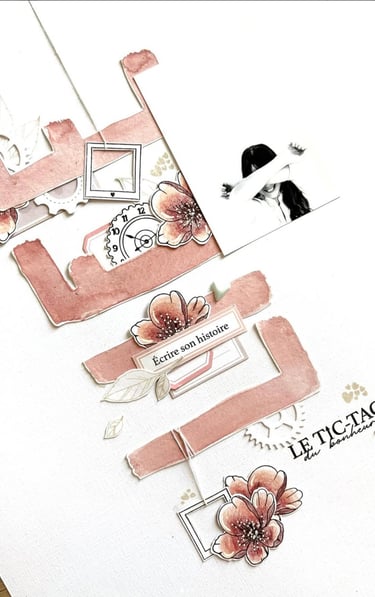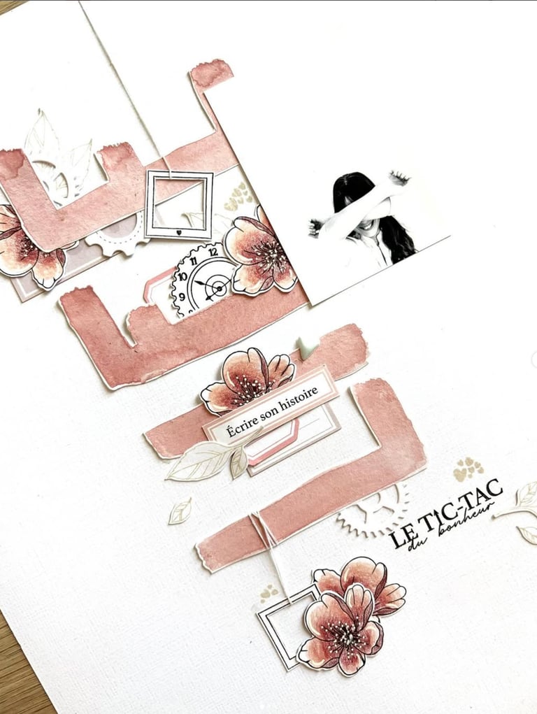 Mon scrap d'ailleurs ? Il reflète mes émotions, il est souvent très love et romantique. J'aime les petits détails, les mises en page soignées et associer différentes matières.